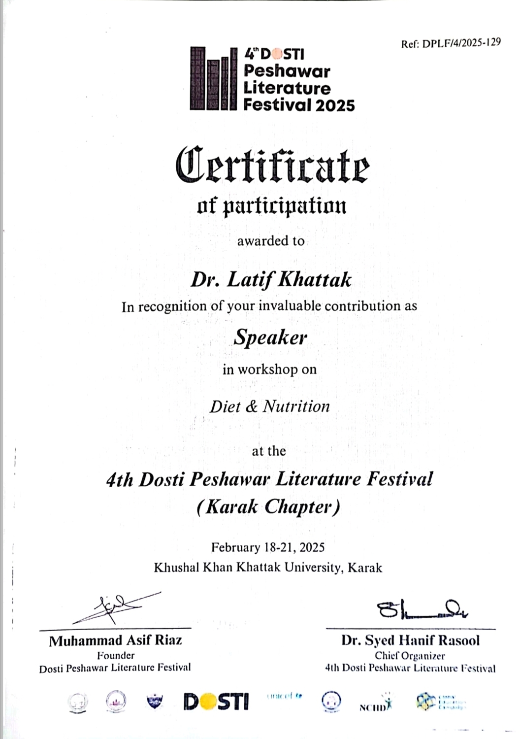 The event was a remarkable platform for engaging discussions on education, health, and community well-being, bringing together scholars, researchers, and students. We extend our gratitude to the Dosti Peshawar Literature Festival team for organizing this impactful initiative and recognizing Dr. Khattak’s contribution with a certificate of appreciation.